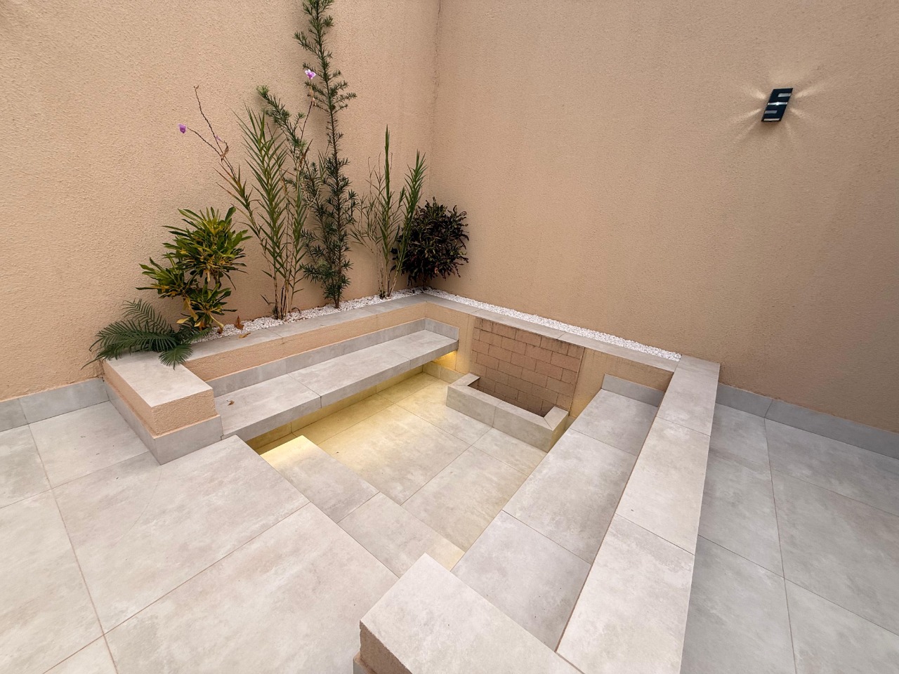 - Espaço com fire place e paisagismo cuidadosamente planejado, com destaque para oliveira natural integrada ao ambiente interno